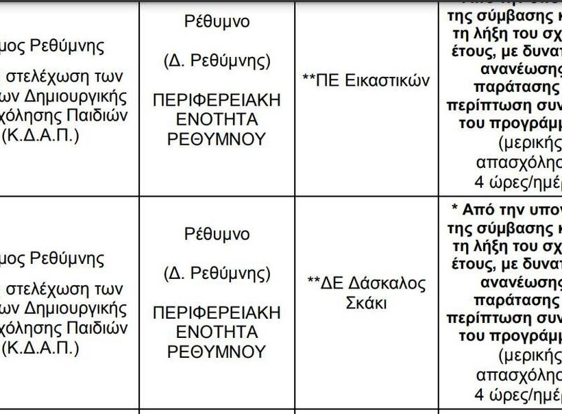 Σύμφωνα με την προκήρυξη ζητούνται 24 συνολικά άτομα στα Κέντρα Δημιουργικής Απασχόλησης του Δήμου Ρέθυμνο ενώ, οι συμβάσεις θα έχουν διάρκεια έως τη λήξη του σχολικού έτους, με δυνατότητα ανανέωσης ή παράτασης σε περίπτωση συνέχισης του προγράμματος, αρχής γενομένης από την υπογραφή της σύμβασης.