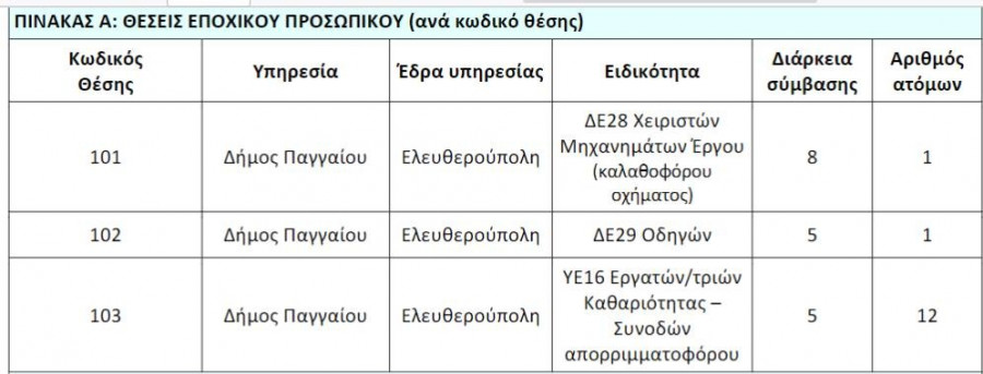 ΑΣΕΠ: Ο Δήμος Παγγαίου ανακοινώνει την πρόσληψη, με σύμβαση εργασίας ιδιωτικού δικαίου ορισμένου χρόνου, συνολικά δεκατεσσάρων ατόμων για την κάλυψη εποχικών ή παροδικών αναγκών των υπηρεσιών του.