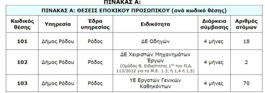 Ο Δήμος Ρόδου ανακοινώνει την πρόσληψη, με σύμβαση εργασίας ιδιωτικού δικαίου ορισμένου χρόνου, για την αντιμετώπιση κατεπειγουσών εποχικών ή πρόσκαιρων αναγκών στον τομέα της πυρασφάλειας, σύμφωνα με τις διατάξεις του άρθρου 206 του Ν. 3584/2007 «Κώδικας Κατάστασης Δημοτικών και Κοινοτικών Υπαλλήλων», όπως αντικαταστάθηκε και ισχύει, ενενήντα (90) ατόμων.