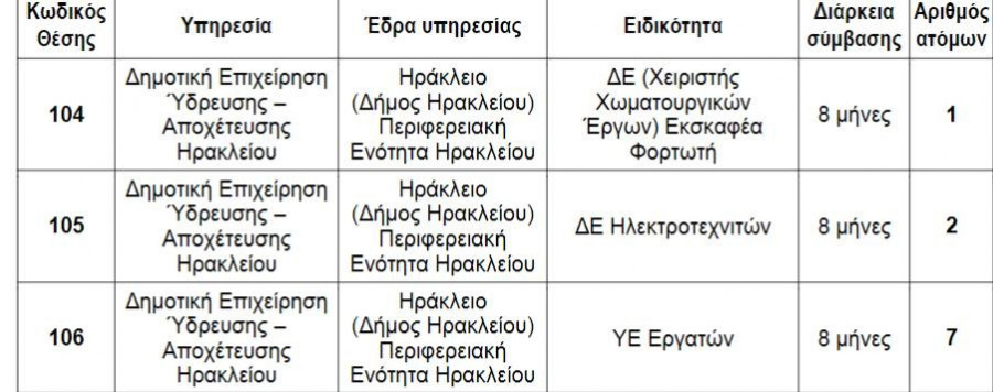 H πρόσληψη θα γίνει με σύμβαση εργασίας ιδιωτικού δικαίου ορισμένου χρόνου, για την κάλυψη εποχικών ή παροδικών αναγκών ανταποδοτικού χαρακτήρα της Δημοτικής Επιχείρησης Ύδρευσης – Αποχέτευσης Ηρακλείου (Δ.Ε.Υ.Α.Η.), που εδρεύει στο Ηράκλειο της Περιφερειακής Ενότητας Ηρακλείου.