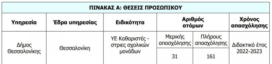 Οι θέσεις αφορούν σε μερική και πλήρους απασχόληση για καθαριστές/καθαρίστριες σχολικών μονάδων κατά το διδακτικό έτος 2022 - 2023.