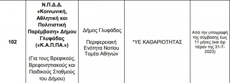 Την πρόσληψη, με σύμβαση εργασίας ιδιωτικού δικαίου ορισμένου χρόνου, συνολικά επτά ατόμων στο ΝΠΔΔ «Κοινωνική Αθλητική και Πολιτιστική Παρέμβαση» Δήμου Γλυφάδας» («Κ.Α.Π.Π.Α.»), που εδρεύει στο Δήμο Γλυφάδας της Περιφερειακής Ενότητας Νοτίου Τομέα Αθηνών.