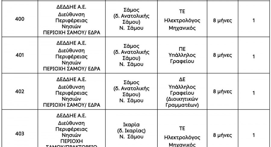Ο ΔΕΔΔΗΕ ανακοίνωσε την πρόσληψη 11 υπαλλήλων για τους νομούς Σάμου, Ικαρίας και Αγαθονησίου.