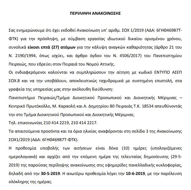 ΑΣΕΠ: Στην πρόσληψη 27 υπαλλήλων κινείται μέσω της προκήρυξης ΣΟΧ1/2019 του ΑΣΕΠ το Πανεπιστήμιο Πειραιώς.