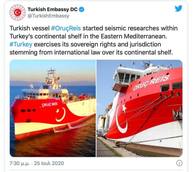 Οι Τούρκοι συνεχίζουν να επιδίδονται σε ένα επικίνδυνο προπαγανδιστικό παιχνίδι, λίγο μετά τις 11.30 το βράδυ του Σαββάτου, η τουρκική πρεσβεία στην Ουάσιγκτον διέγραψε το tweet με το οποίο ανακοίνωνε ότι το Oruc Reis ξεκίνησε σεισμικές έρευνες.