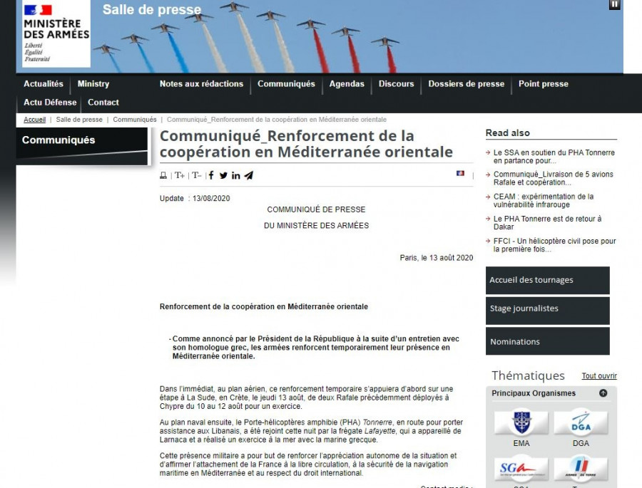 «Σε ό,τι αφορά το Ναυτικό, το αμφίβιο ελικοπτεροφόρο (PHA) Tonnerre (Βροντή), που βρίσκεται καθ’ οδόν για να φέρει βοήθεια στου Λιβανέζους, συνοδεύεται από το βράδυ από την φρεγάτα Λαφαγιέτ, η οποία απέπλευσε από τη Λάρνακα κι έκανε θαλάσσια άσκηση με το Ελληνικό Ναυτικό.