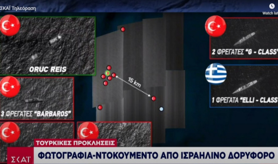 Συγκεκριμένα, φαίνεται το τουρκικό ερευνητικό που έχει απλωμένα καλώδια να συνοδεύεται από 2 ρυμουλκά αλλά και 3 φρεγάτες κλάσης Μπαρμπαρός, 2 κορβέτες Burak και 2 φρεγάτες G-CLASS που ανήκουν στο τουρκικό ναυτικό.