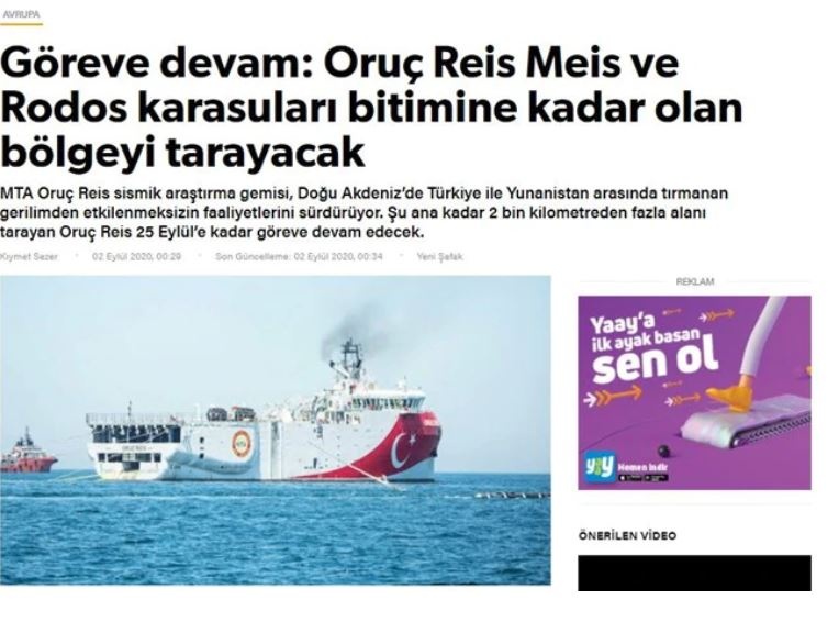 Το δημοσίευμα της φιλοκυβερνητικής εφημερίδας που έχει τίτλο «Συνεχίζει την αποστολή του: Το Oruc Reis θα κάνει έρευνες μέχρι τη Ρόδο και το Καστελόριζο» ευθυγραμμίζεται πλήρως με το κλίμα της προπαγάνδας και της τουρκικής προκλητικότητας στην Ανατολική Μεσόγειο.