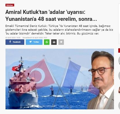 Με δηλώσεις του στο veryansintv.com ο απόστρατος ναύαρχος Ντενίζ Κουτλούκ ζητάει από την κυβέρνηση Ερντογάν να αποστείλει «τελεσίγραφο» στην Ελλάδα, για άμεσο αφοπλισμό 16 νησιών του Αιγαίου.