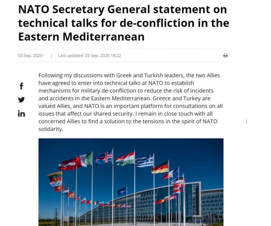 «Οι πληροφορίες που είδαν το φως της δημοσιότητας σχετικά με φερόμενες τεχνικές συνομιλίες στο ΝΑΤΟ δεν ανταποκρίνονται στην πραγματικότητα. Σε κάθε περίπτωση, έχουμε συγκρατήσει την πρόθεση του ΓΓ του ΝΑΤΟ να εργαστεί για να θεσπίσει μηχανισμούς αποκλιμάκωσης στο πλαίσιο του ΝΑΤΟ. Πλην όμως, αποκλιμάκωση συνιστά μόνον η άμεση απομάκρυνση όλων των τουρκικών πλοίων από την ελληνική υφαλοκρηπίδα».
