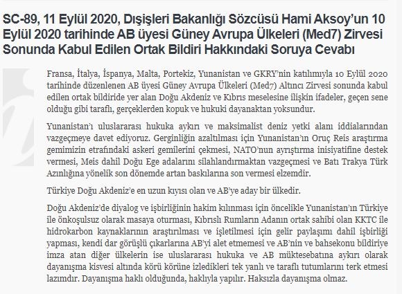 «Η κοινή δήλωση σχετικά με το ζήτημα της Ανατολικής Μεσογείου και της Κύπρου στην οποία έγινε δεκτή στο τέλος της έκτης συνόδου κορυφής των χωρών της Νότιας Ευρώπης των μελών της ΕΕ (Med7) που πραγματοποιήθηκε στις 10 Σεπτεμβρίου 2020 με τη συμμετοχή της Γαλλίας, της Ιταλίας, της Ισπανίας, της Μάλτας, της Πορτογαλίας, της Ελλάδας και της ελληνοκυπριακής διοίκησης, είναι προκατειλημμένη, αποσπασμένη από την πραγματικότητα και στερείται νομικής βάσης.