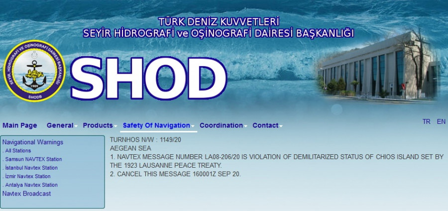 Όπως αναφέρεται στην τουρκική αντι-Navtex - η οποία έχει ισχύ μέχρι την Κυριακή 20 Σεπτεμβρίου-, παραβιάζεται η Συνθήκη της Λωζάνης.