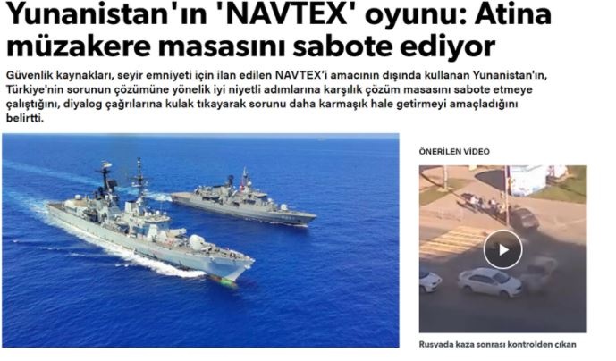Όπως αναφέρει ο τουρκικός Τύπος, η έκδοση Navtex σε μία ευρεία περιοχή στην Ανατολική Μεσόγειο από μη εξουσιοδοτημένο σταθμό -εννοεί τον υδρογραφικό σταθμό του Ηρακλείου Κρήτης- «δεν θα λύσει τα προβλήματα αλλά θα αυξήσει την ένταση στην περιοχή».