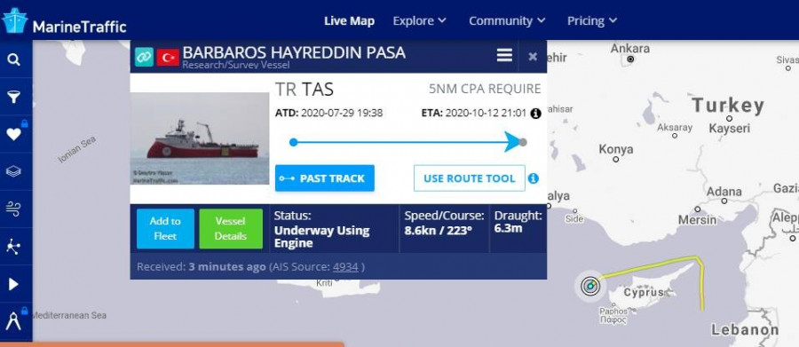 Αυτή τη στιγμή (5.:38 μ.μ. ώρα Ελλάδος) το τουρκικό ερευνητικό σκάφος έχει πορεία προς τα νότια με κατεύθυνση δυτικά της Πάφου, και βρίσκεται μέσα στην κυπριακή ΑΟΖ.