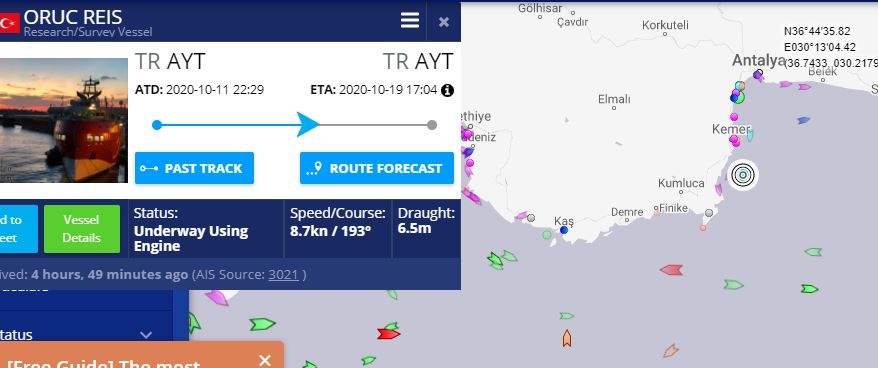 Λίγο μετά τις 4.30 απόγευμα της Δευτέρας το Oruc Reis εισήλθε στο βορειοανατολικότερο άκρο της περιοχής ερευνών της τουρκικής NAVTEX εντός της ελληνικής υφαλοκρηπίδας.