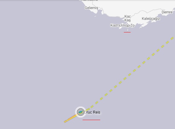 Το τουρκικό ερευνητικό πλοίο έχει τοποθετηθεί περίπου στο μέσον του ανατολικότερου άκρου της παράνομα δεσμευθείσας περιοχής και κινείται νοτιοδυτικά.