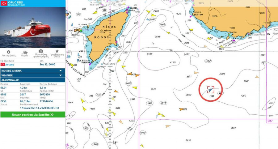Η τελευταία «εμφάνιση», το Oruc Reis ήταν το πρωί της Τρίτης, στις 09:30, περίπου 30 ναυτικά μίλια νότια του Καστελόριζου.