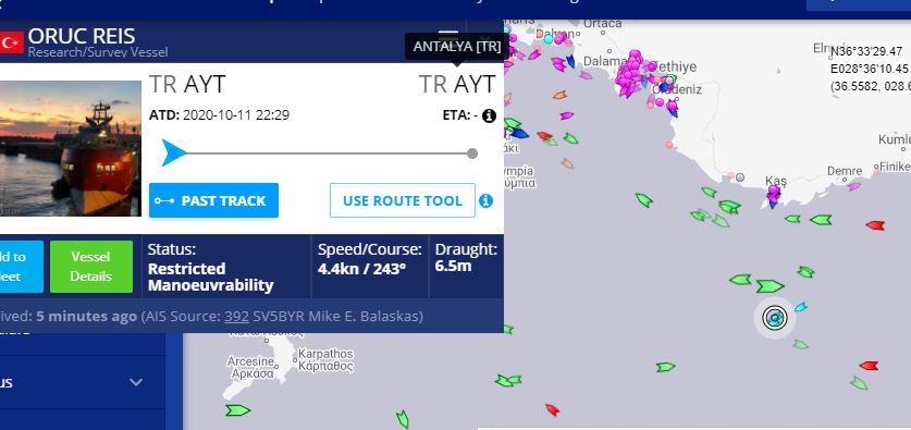 Το Oruc Reis συνεχίζει πλέει αυτή την ώρα με ανοικτό πομπό, εντός της παράνομης Navtex που είχε εκδώσει η Άγκυρα, με αποτέλεσμα να είναι ανιχνεύσιμο το στίγμα του από το σύστημα AIS (Αυτόματο Σύστημα Αναγνωρίσεως).