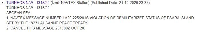 Αξίζει επίσης να σημειωθεί ότι η Άγκυρα εκτός από την NAVTEX με την οποία δεσμεύει την ανωτέρω περιοχή για έρευνες του σκάφους Oruc Reis, παράλληλα αξιώνει την αποστρατιωτικοποίηση των Ψαρών.