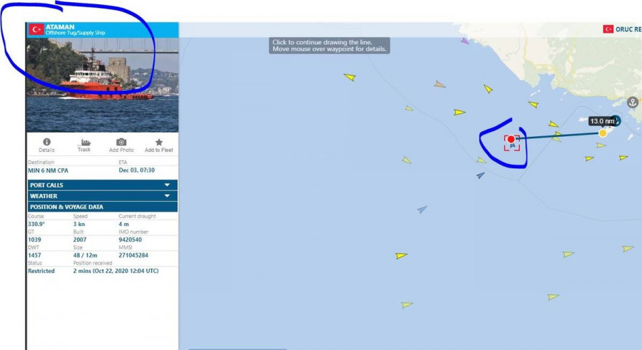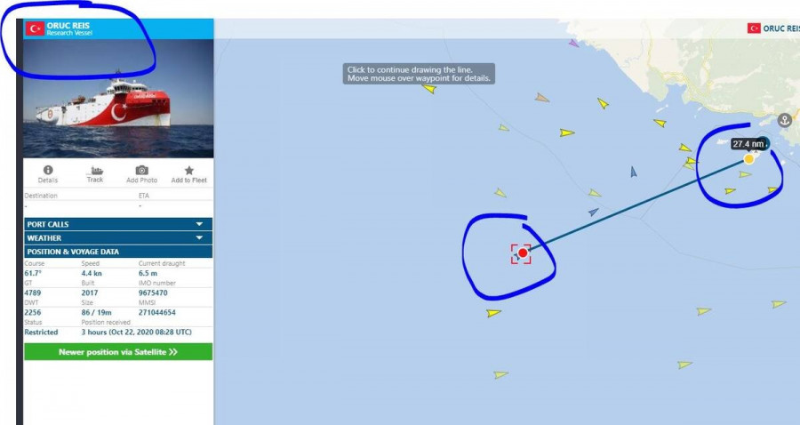Εάν συνεχιστεί η πορεία αυτή το Oruc Reis εκτιμάται ότι σε πολύ λίγο θα βρεθεί σε απόσταση μικρότερη των 12 ναυτικών μιλίων από το Καστελόριζο.