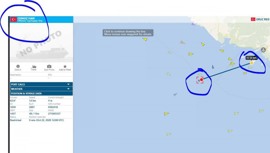 Νωρίτερα στους χάρτες φάνηκε το στίγμα του τουρκικού ερευνητικού πλοίου στις 11:30 ώρα Ελλάδος στα 25 ναυτικά μίλια και μέσα σε 1,5 ώρα διήνησε μια απόσταση περίπου 5 ναυτικών μιλίων καθώς κινείται με ταχύτητα 4,4-4,6 κόμβων.
