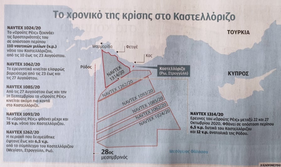 Λίγο μετά τις 14:30 της Παρασκευής το Oruc Reis βρισκόταν σε απόσταση 29,5 ναυτικών μιλών από το Καστελόριζο και 40 ναυτικών μιλίων από την Ρόδο.