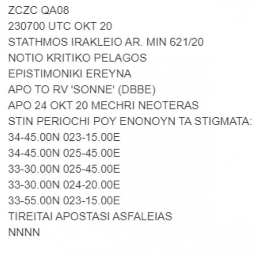 Navtex για επιστημονικές έρευνες νότια της Κρήτης