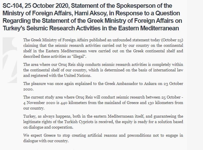 «Το Ελληνικό Υπουργείο Εξωτερικών εξέδωσε σήμερα μια αβάσιμη δήλωση που ισχυρίζεται ότι οι σεισμικές ερευνητικές δραστηριότητες που διεξάγει χώρα μας σε υφαλοκρηπίδα στην Ανατολική Μεσόγειο πραγματοποιήθηκαν στην ελληνική υφαλοκρηπίδα και χαρακτήρισαν αυτές τις δραστηριότητες ως “παράνομες”», αναφέρει στην ανακοίνωση του το τουρκικό ΥΠΕΞ.