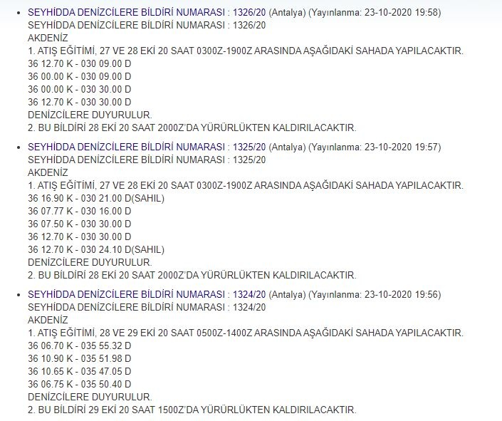 Νέες NAVTEX για άσκηση με πραγματικά πυρά εξέδωσε η Τουρκία για τις 27, 28 και 29 Οκτωβρίου.
