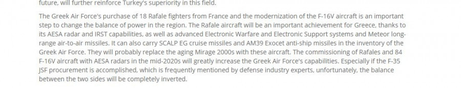 «Η αγορά όμως 18 μαχητικών Rafale της Ελλάδος από τη Γαλλική Πολεμική Αεροπορία και ο εκσυγχρονισμός των αεροσκαφών F-16V είναι ένα σημαντικό βήμα για την αλλαγή της ισορροπίας ισχύος στην περιοχή», αναφέρει μεταξύ άλλων ο Τούρκος αναλυτής και προσθέτει: «Τα αεροσκάφη Rafale θα αποτελέσουν ένα σημαντικό επίτευγμα για την Ελλάδα, χάρη στις δυνατότητες των ραντάρ AESA και των ραντάρ IRST που διαθέτουν, καθώς και των προηγμένων συστημάτων ηλεκτρονικού πολέμου (Electronic Warfare), σε συνδυασμό με τους πυραύλους αέρος-αέρος μεγάλου βεληνεκούς Meteor που είναι εξοπλισμένα».