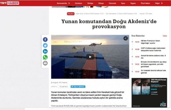 Ενδεικτικό είναι το σχετικό δημοσίευμα από τον ιστότοπο trthaber.com κάνει λόγο για «Πρόκληση από τον Έλληνα διοικητή στην Ανατολική Μεσόγειο» ενώ υποστηρίζει ότι «κατά παράβαση του διεθνούς δικαίου» έγινε έκδοση διαταγής στην γερμανική φρεγάτα «Αμβούργο» να πραγματοποιήσει έλεγχο σε τουρκικό πλοίο «Ροζελίνα Α» που μετέφερε ανθρωπιστική βοήθεια στη Λιβύη.