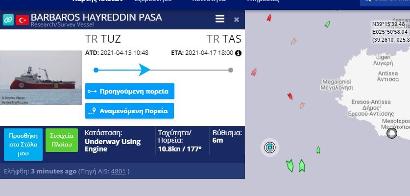 Το ερευνητικό, όπως θα δείτε και στο marine traffic, βρέθηκε λίγα μόλις μίλια μακριά από το νησί της Μυτιλήνης περίπου στις 2 το μεσημέρι.