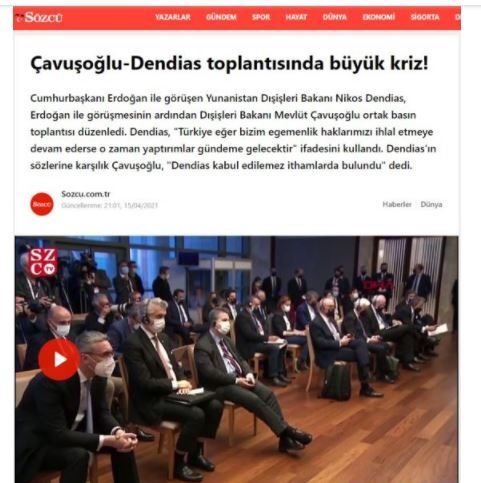 «Μεγάλη κρίση στη συνάντηση Τσαβούσογλου – Δένδια» έγραψε η εφημερίδα Sozcu, προβάλλοντας τις δηλώσεις Τσαβούσογλου για «απαράδεκτες κατηγορίες» από πλευράς Δένδια.