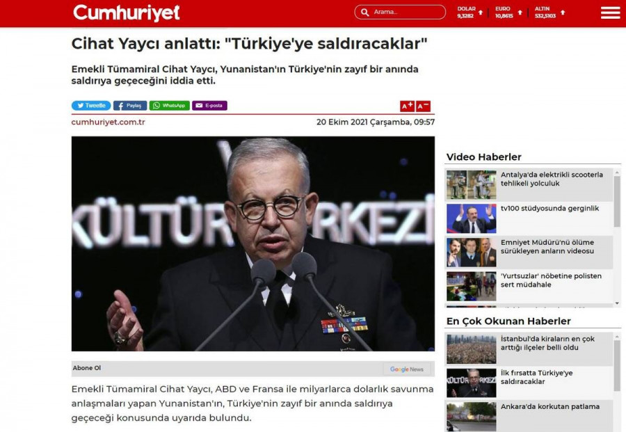 Ο εξτρεμιστής Γιαϊτζί, ναύαρχος εν αποστρατεία, «θεωρητικός» της «Γαλάζιας Πατρίδας» προειδοποίησε πως η Ελλάδα θα επιτεθεί στην Τουρκία, σε κάποια «αδύναμη» στιγμή της, μιλώντας στην Cumhuriyet.