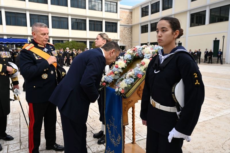 Ο υπουργός Εθνικής Άμυνας, Νίκος Παναγιωτόπουλος, παραβρέθηκε στον εορτασμό του προστάτη του Πολεμικού Ναυτικού. Δώρισε κομμάτι από το πρώτο μέταλλο που κόπηκε στα γαλλικά ναυπηγεία για τις φρεγάτες Belh@rra.