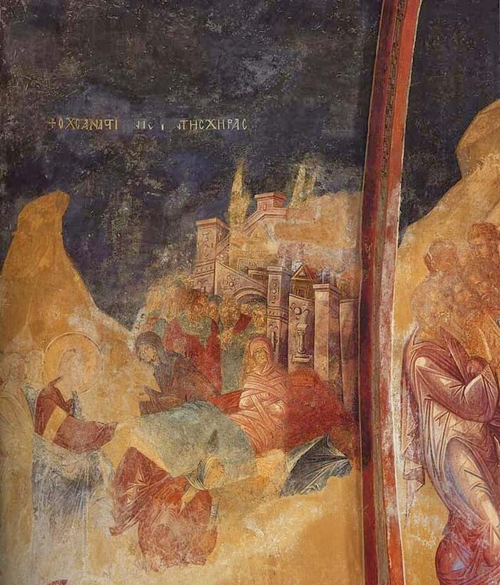 Σύμφωνο με το νεκρικό προορισμό του χώρου είναι και το εικονογραφικό του πρόγραμμα. Μία επιβλητική σύνθεση της Καθόδου του Χριστού στον Άδη διακοσμεί την αψίδα, ενώ μία μνημειακή παράσταση της Δευτέρας Παρουσίας καλύπτει τα ψηλότερα μέρη του ανατολικού τμήματος. Οι δύο παραστάσεις από τα Θαύματα του Κυρίου, η ανάσταση του γιου της χήρας και της κόρης του Ιαείρου, ολοκληρώνουν το πρόγραμμα του ανατολικού τμήματος του παρεκκλησίου, που συνολικά εκφράζει τον Θρίαμβο του Χριστού πάνω στον θάνατο.