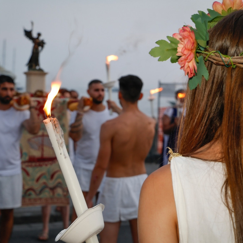 Η οικογένεια Conte και άλλοι ηθοποιοί έφτασαν από το Agrigento και τη Gela. Τιμώμενοι καλεσμένοι ήταν καλλιτέχνες από την Αθήνα που ανήκουν στις ομάδες Atrapos και Atthios, πρωταγωνιστές των Ελληνικών Τελετών. Στην επιστροφή, κατά μήκος της διαδρομής από τη Santa Lucia έως το Castel dell’Ovo, εκτός από την πομπή, πραγματοποιήθηκε και η αναμνηστική Lampadedromia, ο αρχικός αγώνας λαμπαδηδρομίας που οι κάτοικοι του κόλπου αφιέρωναν στην προστάτιδά τους, ώστε να τους φέρει γονιμότητα και ευημερία...