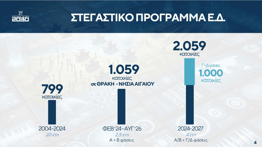 Εμείς, μέχρι τον Αύγουστο του επόμενου χρόνου, θα έχουμε κατασκευάσει στη Θράκη και στα νησιά του Ανατολικού Αιγαίου κυρίως, 1.059 κατοικίες και μέχρι το 2027 θα φτάσουμε στον αριθμό των 2.059 κατοικιών.
