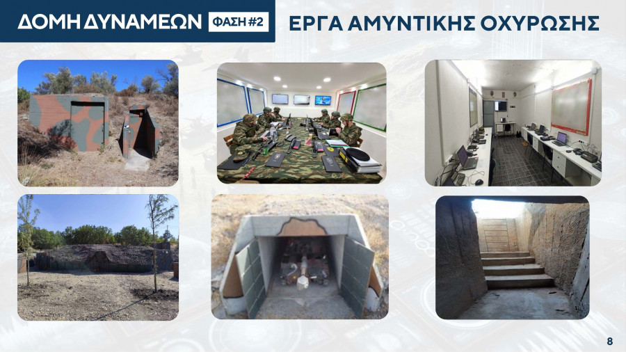 Αναφέρομαι στη δημιουργία σειράς έργων αμυντικής οχύρωσης, κυρίως στον Έβρο και τα νησιά του Ανατολικού Αιγαίου. Η πρόβλεψη που θα ακολουθήσει και τον εκσυγχρονισμό των υπαρχουσών οχυρωματικών δομών - η χώρα έχει ήδη δομές, θα πρέπει απλώς αυτές να τις κάνουμε επιχειρησιακά αξιοποιήσιμες αμέσως - θα προστεθούν όμως 207 έργα στην ηπειρωτική Ελλάδα και 315 έργα στη νησιωτική Ελλάδα. Η πρόβλεψη είναι ότι το 100% θα έχει ολοκληρωθεί στο βάθος μιας τριετίας. Και αυτά, όπως και πολλές άλλες μεταρρυθμίσεις, θα έπρεπε να έχουν γίνει εχθές. Έχουμε υπολογίσει τον προϋπολογισμό αυτών των έργων στα 65 εκατομμύρια ευρώ.