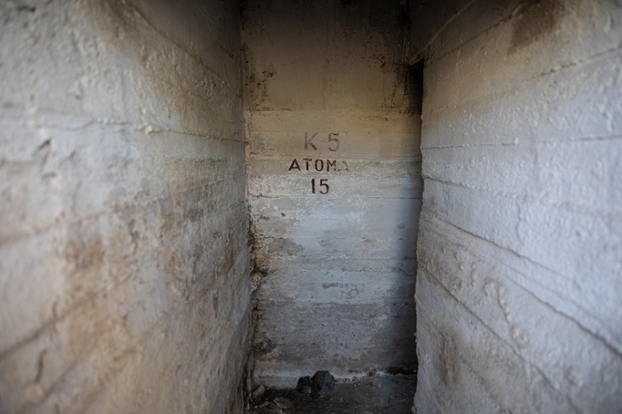 «Το συγκεκριμένο έχει μια κατασκευαστική ιδιαιτερότητα. Οι Γερμανοί κατασκεύαζαν γενικά τα καταφύγιά τους με δύο τρόπους. Υπήρχαν τα λεγόμενα tiefbunkers, τα υπόγεια καταφύγια, και τα hochbunkers, τα υπέργεια καταφύγια. Η διαφορά ήταν ότι οι Γερμανοί σκέφτηκαν, από ένα σημείο και μετά, ότι είναι πολύ πιο φτηνό να χτίσεις κάτι προς τα πάνω, παρά να αναγκαστείς να σκάψεις. Άρα προτιμούσαν πολλές φορές να κάνουν υπέργεια καταφύγια, με μεγαλύτερη ενίσχυση. Και για τα καταφύγια ειδικά αυτά που ήταν υπέργεια υπήρχε ένας συγκεκριμένος τρόπος κατασκευής, σχημάτιζαν ένα είδος πυραμίδας – η διατομή τους- ώστε οι βόμβες να αναπηδούν και να μην χτυπάνε κατευθείαν τον στόχο και να μειώνονται έτσι οι απώλειες. Ο χώρος που βρισκόμαστε είναι μια υβριδική τέτοια εγκατάσταση. Βρισκόμαστε 1-2 μέτρα υπογείως, αλλά παράλληλα η κορυφή εκτείνεται προς τα πάνω. Το ύψος του καταφυγίου είναι περίπου 4 μέτρα, έχει ένα ιδιαίτερα μεγάλο πάχος στα τοιχώματά του. Οι ελληνικές προδιαγραφές κατασκευής καταφυγίων της εποχής όριζαν τα 30 εκατοστά ως ένα καλό πάχος σε τοίχο με οπλισμένο σκυρόδεμα. Ο χώρος που είμαστε εδώ έχει τουλάχιστον 60 εκατοστά, είναι στρατιωτικών προδιαγραφών» μας λέει ο κ. Κυρίμης, ενώ βρισκόμαστε σε έναν χώρο ο οποίος δεν ενδείκνυται ακριβώς για επίσκεψη από κλειστοφοβικούς.