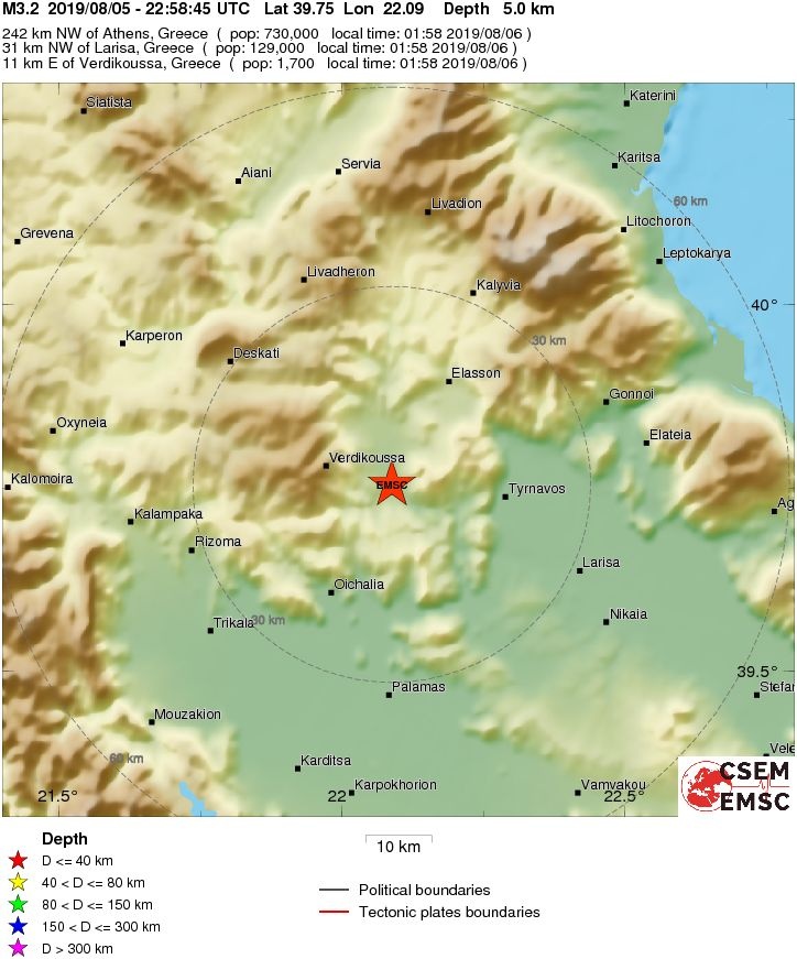 Σεισμός Τώρα: Ασθενής σεισμική δόνηση μεγέθους 3,2 βαθμών της κλίμακας Ρίχτερ (σύμφωνα με την αυτόματη λύση του Ευρωπαϊκού - Μεσογειακού EMSC), σημειώθηκε τα ξημερώματα της Τρίτης (6/8), στη 01:58 μετά τα μεσάνυχτα, σε περιοχή της Θεσσαλίας.
