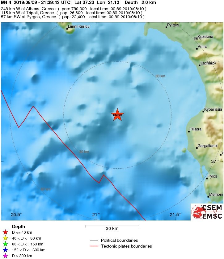 Σεισμός Τώρα: Σεισμική δόνηση μεγέθους 4,4 βαθμών της κλίμακας Ρίχτερ, σύμφωνα με την αυτόματη προκαταρκτική λύση του Ευρωπαϊκού - Μεσογειακού Σεισμολογικού Ινστιτούτου (EMSC), σημειώθηκε στις 00:39 μετά τα μεσάνυχτα (ξημερώματα Σαββάτου 10/8) , σε υποθαλάσσια περιοχή του Ιονίου Πελάγους.