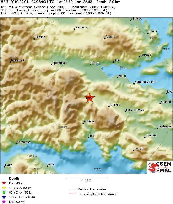 Σεισμός Τώρα: Σεισμική δόνηση μεγέθους 3,7 βαθμών της κλίμακας Ρίχτερ (σύμφωνα με την αναθεωρημένη λύση του Ευρωπαϊκού - Μεσογειακού EMSC), σημειώθηκε το πρωί της Τετάρτης (4/9), στις 07:08, σε περιοχή του νομού Φθιώτιδας, κοντά στην Αμφίκλεια.