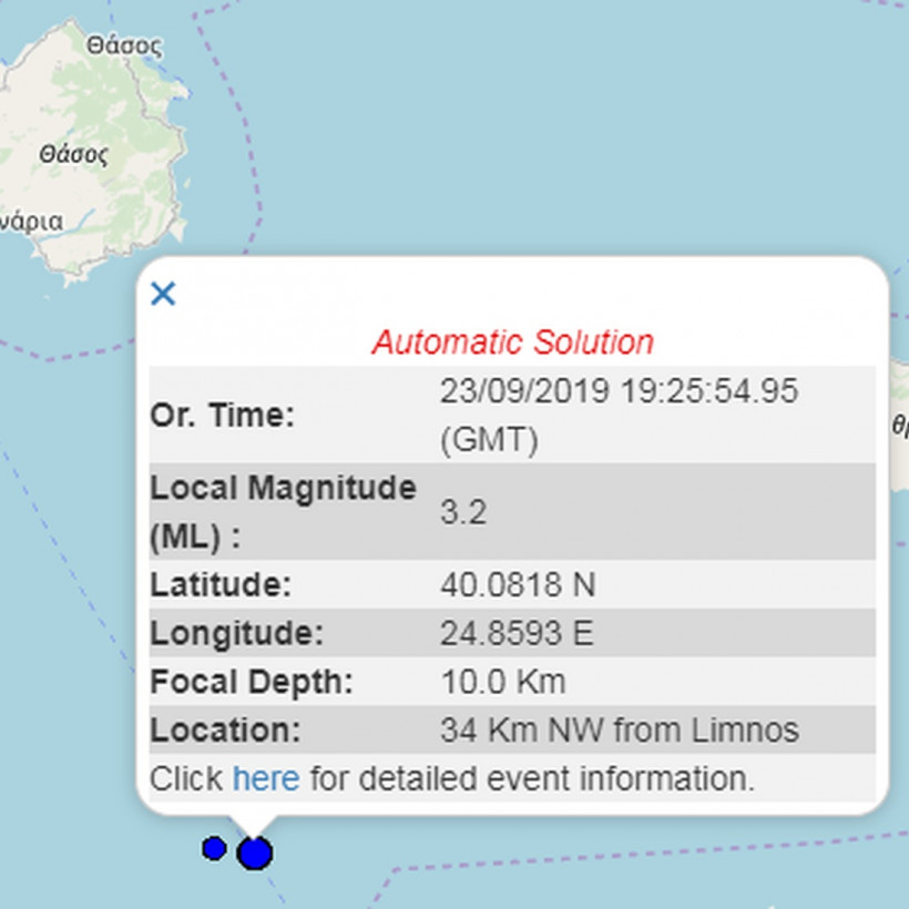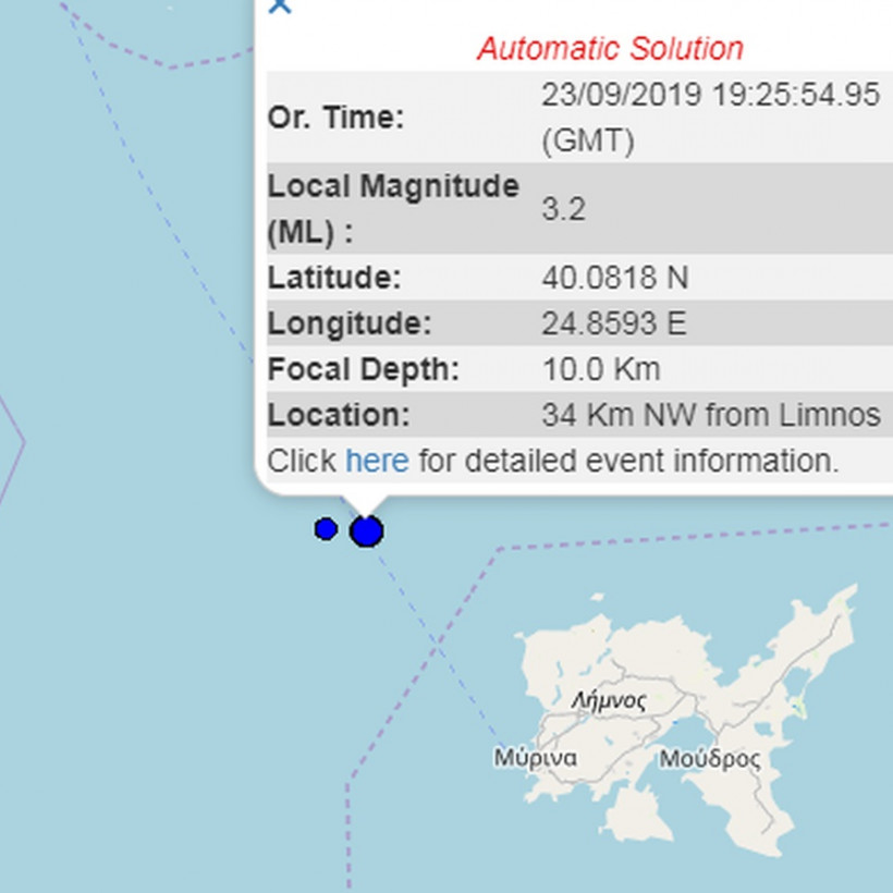 Το επίκεντρο του σειμού εντοπίσηκε 34χλμ βορειοδυτικά του νησιού της Λήμνου ενώ το εστιακό βάθος του υπολογίζεται στα 10χλμ.