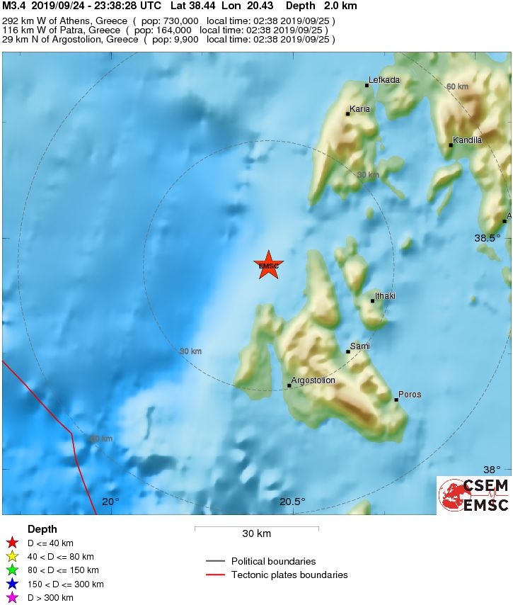 Σεισμός Τώρα: Ασθενής σεισμική δόνηση μεγέθους 3,4 βαθμών της κλίμακας Ρίχτερ (σύμφωνα με την αυτόματη λύση του Ευρωπαϊκού - Μεσογειακού EMSC), σημειώθηκε τα ξημερώματα της Τετάρτης (25/9), στις 02:38, σε υποθαλάσσια περιοχή, κοντά στις βόρειες ακτές της Κεφαλονιάς