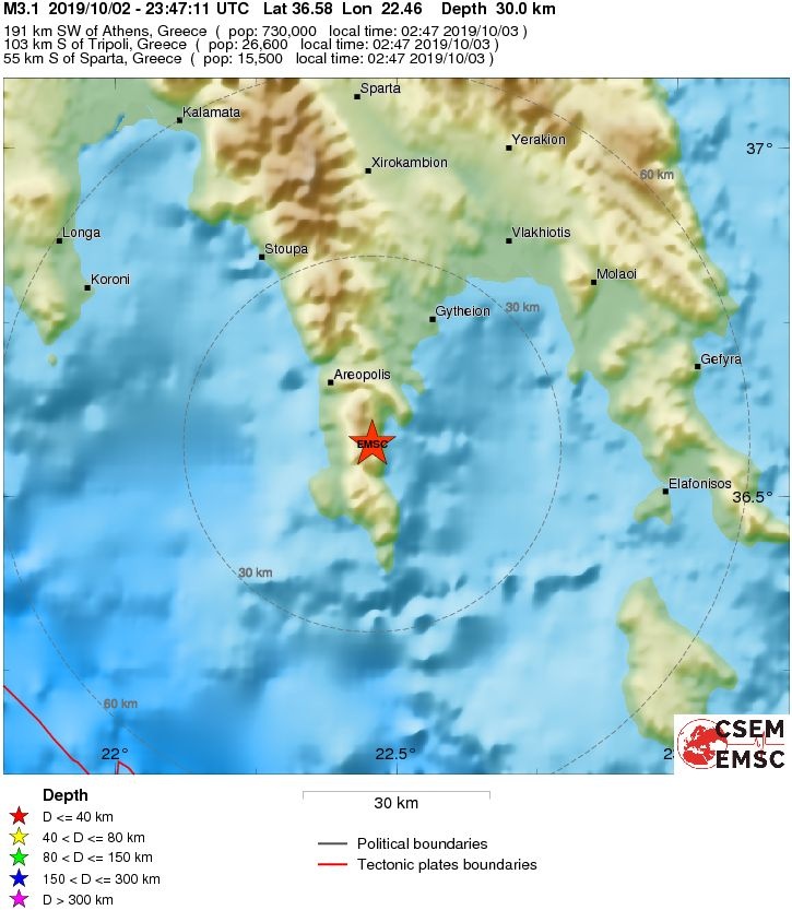 Το εστιακό βάθος του σεισμού, σύμφωνα με την εκτίμηση του EMSC, υπολογίζεται στα 30 χλμ.