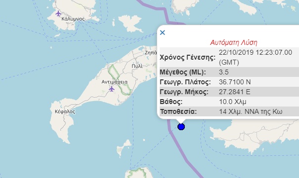 Σεισμός σημειώθηκε, σύμφωνα με την αυτόματη λύση του Γεωδυναμικού Ινστιτούτου, στις 15:23 την Τρίτη (22/10) 14 χλμ νότια νοτιοανατολικά της Κω, με αποτέλεσμα να ταρακουνηθεί το νησί.