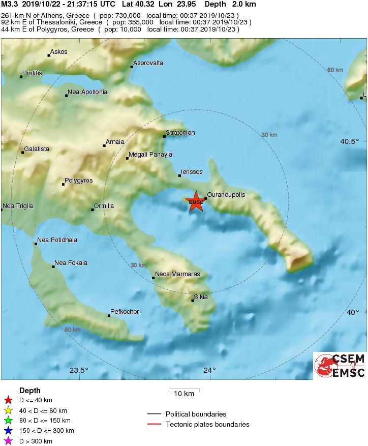 Σεισμός Τώρα: Ασθενής σεισμική δόνηση μεγέθους 3,3 βαθμών της κλίμακας Ρίχτερ (σύμφωνα με την αυτόματη λύση του Ευρωπαϊκού - Μεσογειακού EMSC), σημειώθηκε στις 00:37 μετά τα μεσάνυχτα (ξημερώματα Τετάρτης 23/10), σε υποθαλάσσια περιοχή, κοντά στις ακτές του Αγίου Όρους.