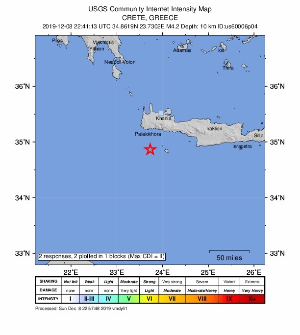 Το ακριβές επίκεντρο τη δόνησης εντοπίζεται στα 35 χλμ. νότια των Χανίων και στα 110 χλμ. νοτιοανατολικά του Ηρακλείου.