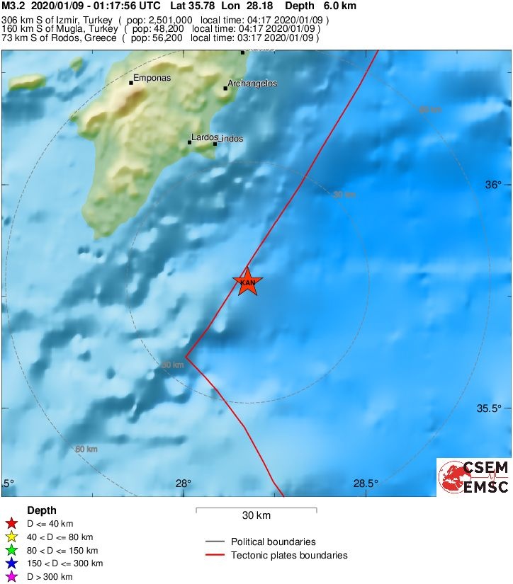 Σεισμός Τώρα: Ασθενής σεισμική δόνηση μεγέθους 3,2 βαθμών της κλίμακας Ρίχτερ (σύμφωνα με την αυτόματη λύση του Ευρωπαϊκού - Μεσογειακού EMSC), σημειώθηκε τα ξημερώματα της Πέμπτης (9/1), στη 03:17, σε υποθαλάσσια περιοχή, νότια της Ρόδου.